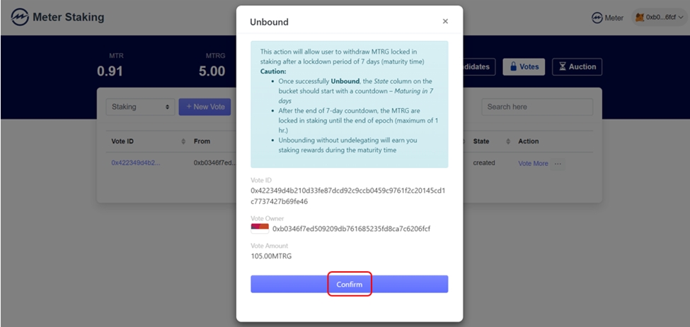 Note: MTRG is locked in staking until the end of epoch once “Unbound” countdown is over. Please wait until the end of current epoch to ensure MTRG are available in your account. The ‘state’ column displays the additional time as ‘Matured 50 mins ago’